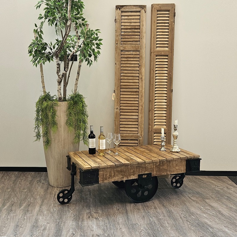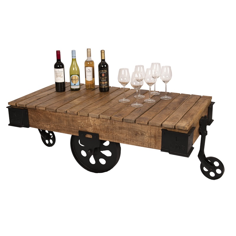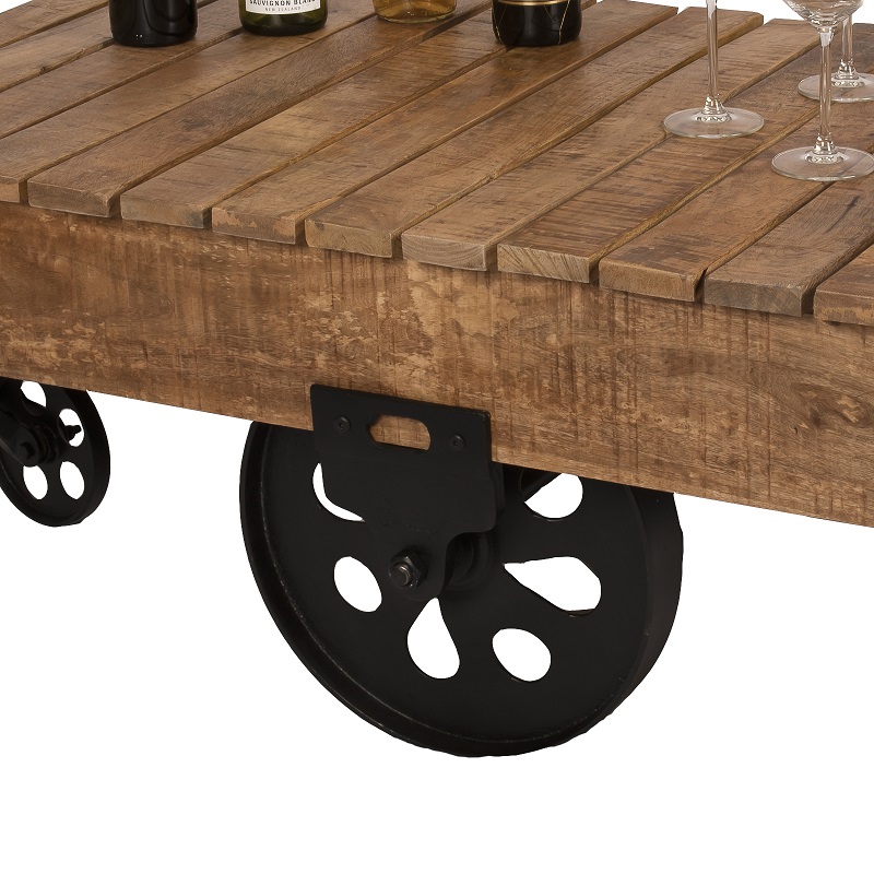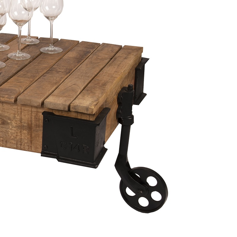 Een meer industriële salontafel dan deze FELINE is bijna niet te vinden. Met zijn gietijzeren elementen en het ruwe vintage afgewerkte hout is dit een heel stoere verrijdbare drankenwagen. Met zijn 2 grote en 2 kleine ijzeren wielen kun je deze trolley ook gebruiken als koffietafel of gewoon neerzetten als blikvanger voor in je interieur of horecazaak.