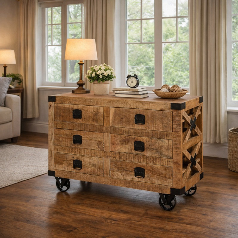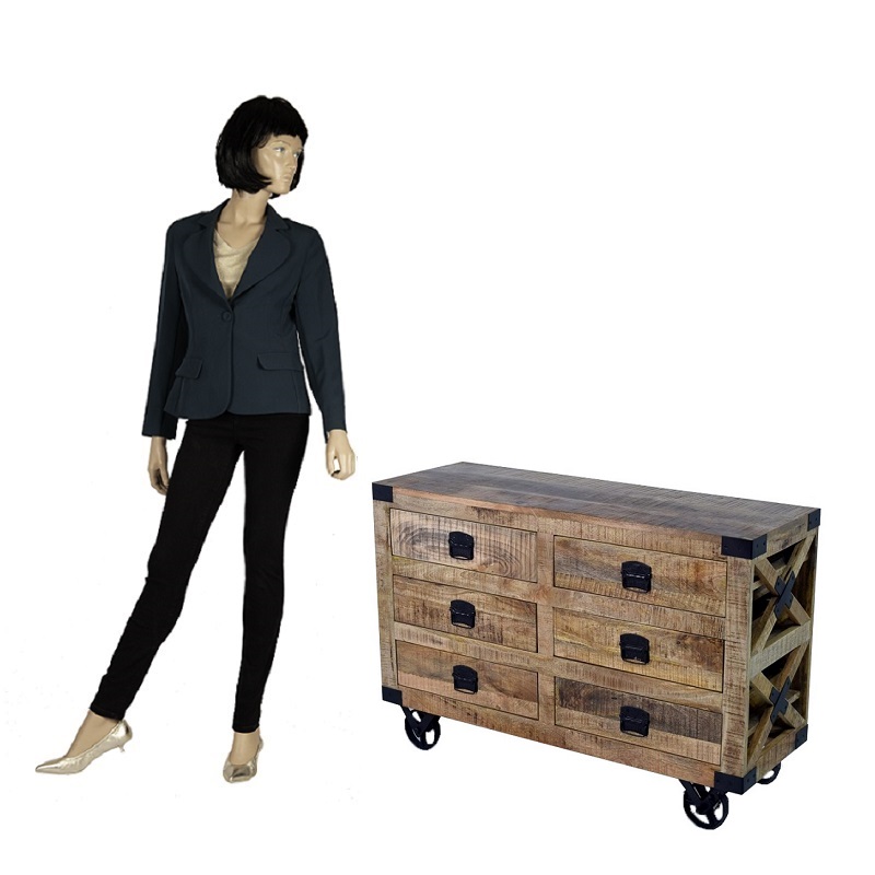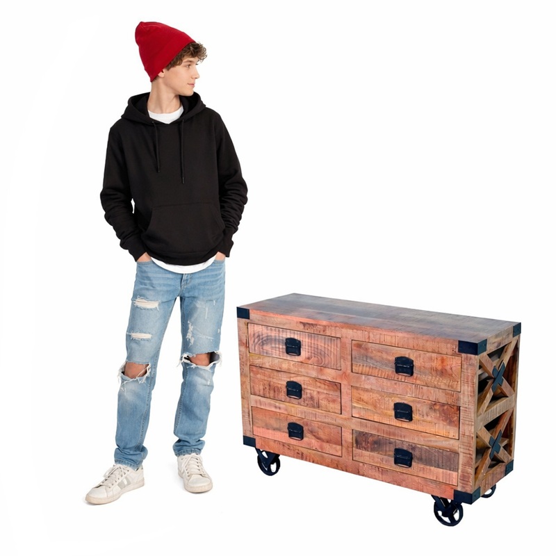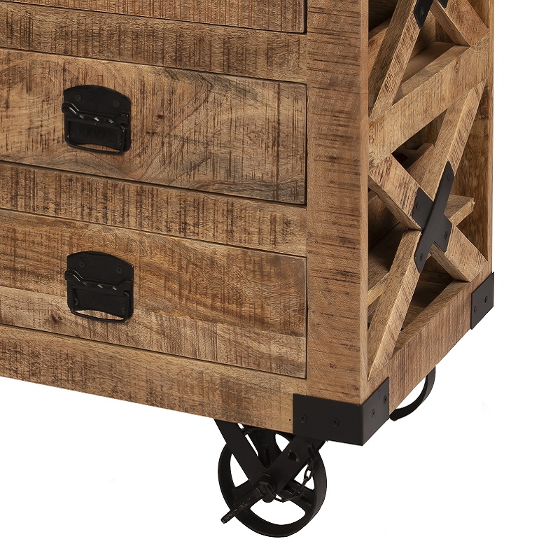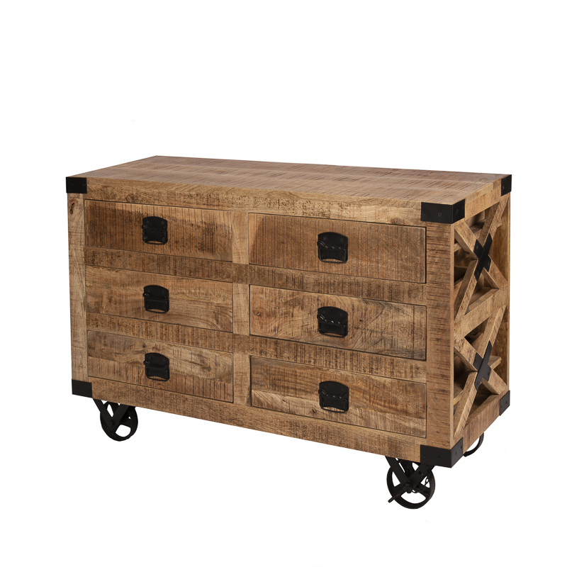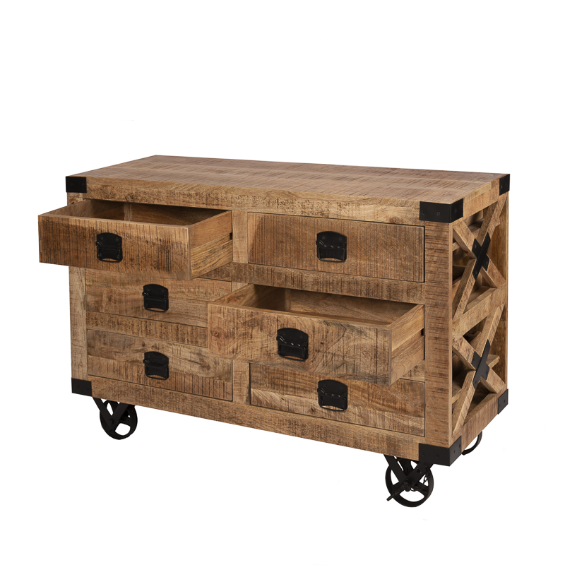 De Gilliam industriële ladekast van mango hout is met zijn bijzondere uiterlijk en hoekbeschermers in zwart metaal een bijzondere verschijning. Door zijn grote wielen is deze ladekast goed verrijdbaar en met zijn 6 laden ook een leuke toevoeging voor een restaurant of café.