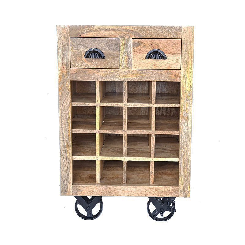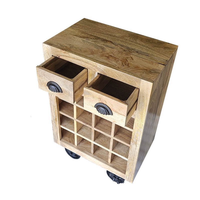 De stijlvolle verrijdbare Klara wijnkast in balinese stijl is gemaakt van mango hout en is geschikt als wijnrek waar je 16 flessen in kunt opbergen met daarboven een uittrekbare lade voor het opbergen van diverse drank accessoires. Door zijn klassieke uitstraling past deze drankenkast goed in een vintage, horeca of industrieel interieur.