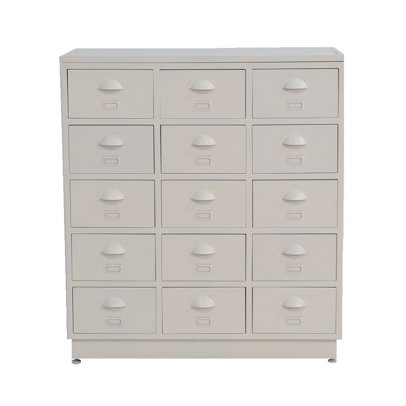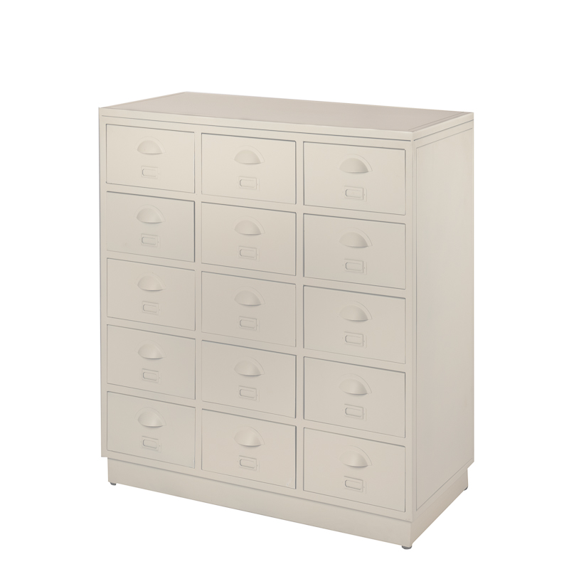 De ONE FIVE industriële ladekast met matte lak is volledig van metaal en is geproduceerd op de ouderwetse wijze. Door deze “ruwe ouderwetse” manier van productie, lakken en bijlakken heeft de ladenkast een industrieel refurbished uitstraling en haal je met zijn retro look de vervlogen tijden weer in huis. De 15 laden van deze vintage look ladekast zijn op de klassieke manier van staal op staal uittrekbaar en uitermate geschikt voor het opbergen van je spullen thuis of op kantoor.