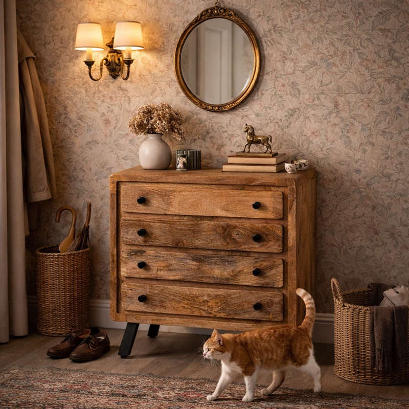 De PEARL dressoir kast van mango hout heeft een stalen 4 poots onderstel en 4 uittrekbare laden. Met zijn retro look zal dit dressoir een mooie toevoeging zijn voor elk vintage interieur en is tevens mooi te combineren met de Perry dressoir kast. De Pearl wordt gemonteerd geleverd en is klaar voor gebruik.