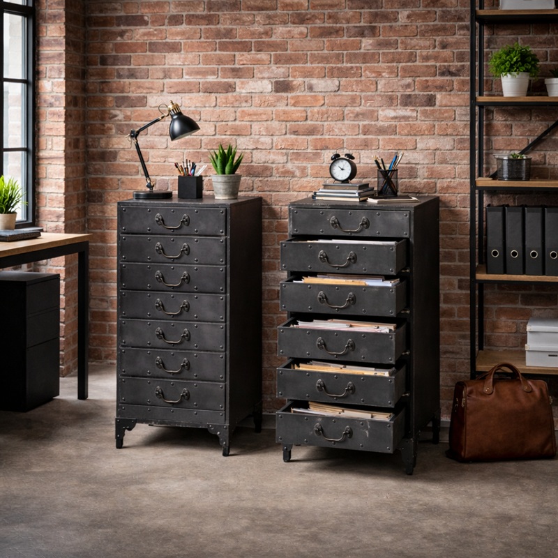 De RAMIRO ladekast van staal heeft de ultieme industriële uitstraling. Door zijn hangende handgrepen en vintage zwarte lak is dit een bijzonder stoere ladekast voor elke industrieel of vintage interieur. De metalen ladekast staat op 4 pootjes en is uitgevoerd met 8 uitschuifbare laden voorzien van een hangende handgreep.