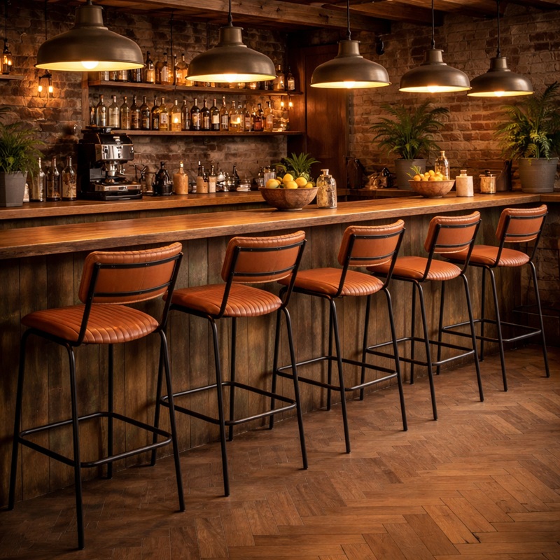De retro barkruk ROUTE 99 is een vintage look horeca barkruk met een stevig zwart metalen frame, gecombineerd met het leer in de kleur cognac krijgt de barstoel hierdoor ook een industrieel uiterlijk