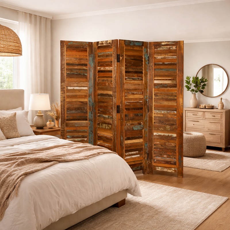 Het SEPARATE FOUR vintage look kamerscherm kunt u gebruiken om wat privacy te creëren of gewoon als decoratief element toevoegen aan uw woon- of slaapkamer. Het scherm is in 4 delen scharnierbaar en wordt gemonteerd geleverd klaar voor gebruik. Doordat de materialen van deze privacy schermen bestaat uit gerecycled hout bestaan kunnen kleuren en houtsoorten afwijken van het getoonde voorbeeld en de voor- en achterkant van het kamerscherm verschillende van kleuren.