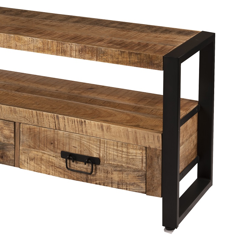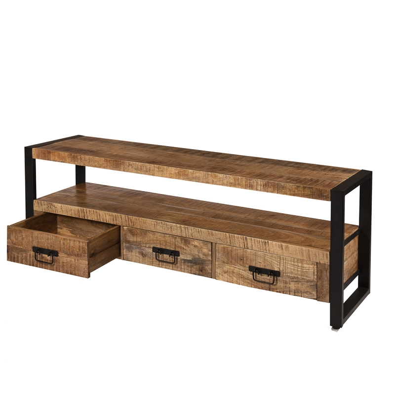 Het TV-meubel SIMON is uitgevoerd in staal gecombineerd met mango hout en is uitermate passend in een industrieel, balinees of vintage interieur. Dit tv meubel heeft 3 laden waar je diverse spullen in kunt opbergen en je kunt de Simon uiteraardt ook gewoon als dressoir gebruiken.