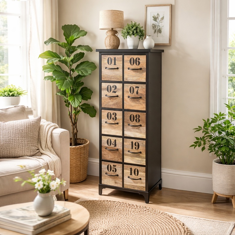 De WALDORF industriële ladekast is door zijn combinatie van hout en staal een bijzonder mooie ladekast wat voor elke vintage omgeving een stoere aanvulling zal zijn. De WALDORF staat op 4 pootjes, heeft een vintage zwarte lak en is uitgevoerd met 10 uitschuifbare laden om van alles en nog wat in te kunnen opbergen. Door zijn compacte afmeting zal deze ladekast ook nog eens niet te veel plek in beslag nemen en is goed te combineren met de Waldorf ladekast.